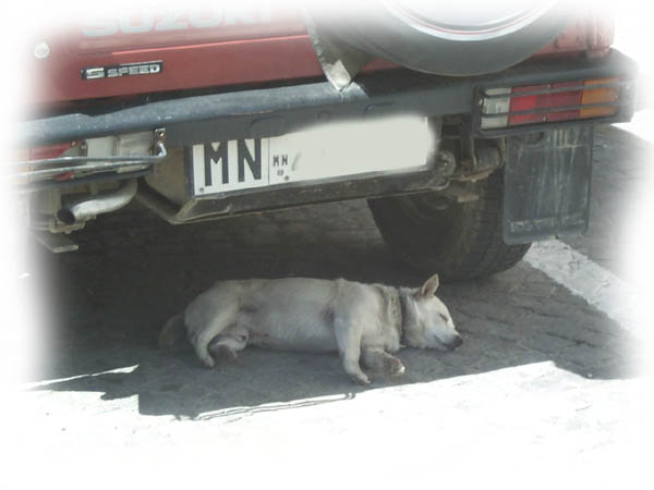 sitzen an der Kirche oder dem Haus im Schatten, man grüsst sich, unterhält sich